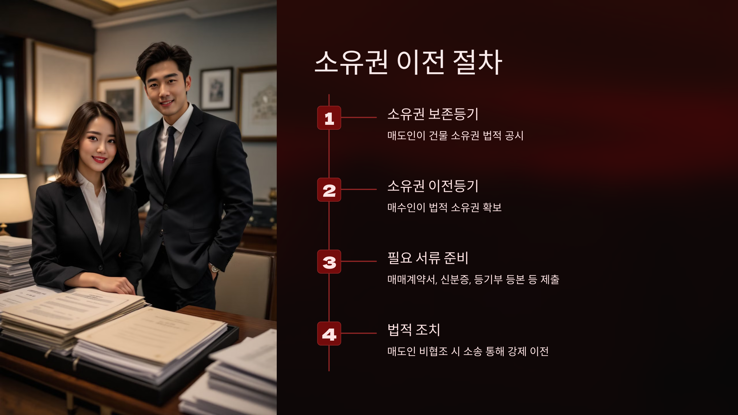 소유권 이전을 위해서는 우선 소유권 보존등기를 완료해야 합니다. 매도인이 해당 건물에 대한 소유권 보존등기를 신청한 후, 매수인은 자신의 명의로 소유권 이전등기를 신청해야 합니다. 이 절차는 법적 소유자임을 주장하기 위해 필수적입니다. 만약 이 절차를 생략한다면 법적으로 소유권을 주장할 수 없으며, 향후 발생할 수 있는 법적 분쟁에 휘말릴 위험이 높습니다.