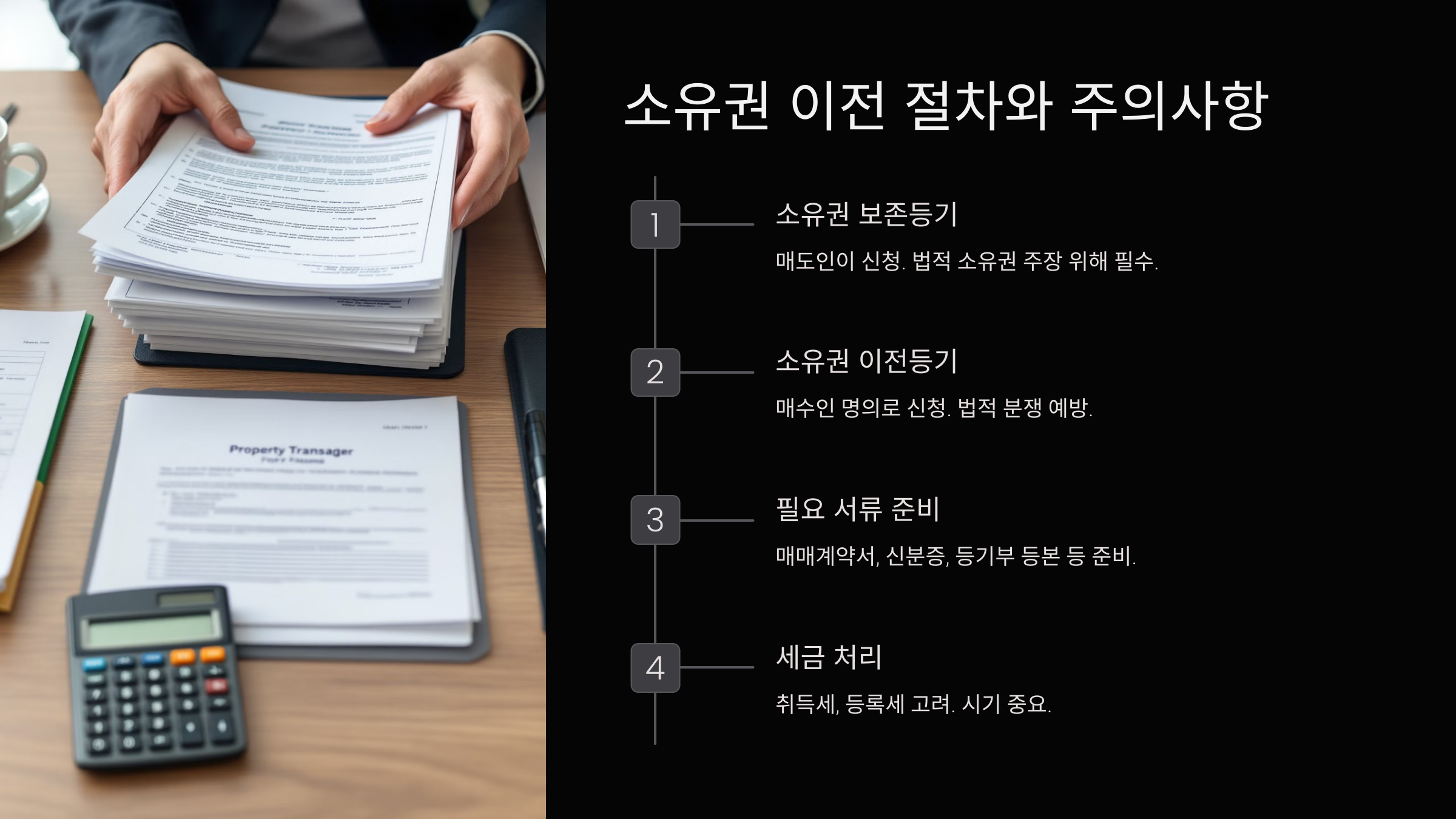 소유권 이전 절차를 이행할 때 주의해야 할 사항은 여러 가지가 있습니다. 첫째, 모든 서류는 정확하게 작성되어야 하며, 누락된 정보가 없어야 합니다. 둘째, 매도인이 소유권 보존등기를 마치지 않는 경우, 매수인은 법적 조치를 취해야 할 수 있습니다. 셋째, 소유권 이전이 지연되면 추가적인 세금 문제가 발생할 수 있으므로, 신속하게 절차를 진행해야 합니다. 만약 이러한 절차가 지연될 경우 발생할 수 있는 세금은 매우 큰 부담이 될 수 있습니다.